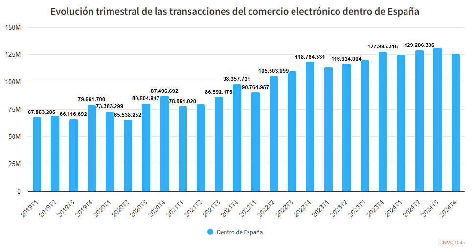 Segons dades de la Comissió Nacional dels Mercats i la Competència (CNMC), el comerç electrònic a Espanya va superar per primer cop els 100.000 milions d’euros anuals el 2022. I la tendència no para de créixer com es pot veure en la gràfica, que en cinc anys les transaccions s’han duplicat.