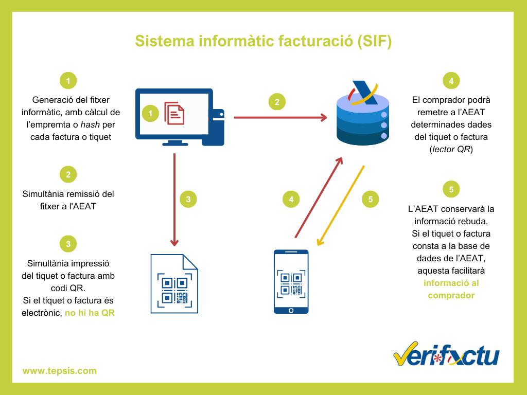 Article 1.2 del reglament “A l’efecte del present Reglament, el terme factura inclou la factura completa i la factura simplificada, d’acord amb el Reglament pel qual es regulen les obligacions de facturació, aprovat pel Reial decret 1619/2012, de 30 de novembre. Es considera sistema informàtic de facturació al conjunt de maquinari i software utilitzat per a expedir factures mitjançant la realització de les següents accions: a) Admetre l’entrada d’informació de facturació per qualsevol mètode. b) Conservar la informació de facturació, ja sigui mitjançant el seu emmagatzematge en el propi sistema informàtic de facturació o mitjançant la seva sortida a l’exterior del mateix en un suport físic de qualsevol tipus i naturalesa o a través de la remissió telemàtica a un altre sistema informàtic, sigui o no de facturació. c) Processar la informació de facturació mitjançant qualsevol procediment per a produir altres resultats derivats, independentment d’on es realitzi aquest procés, podent ser en el propi sistema informàtic de facturació o en un altre sistema informàtic prèvia remissió de la informació al mateix per qualsevol via directa o indirecta.”